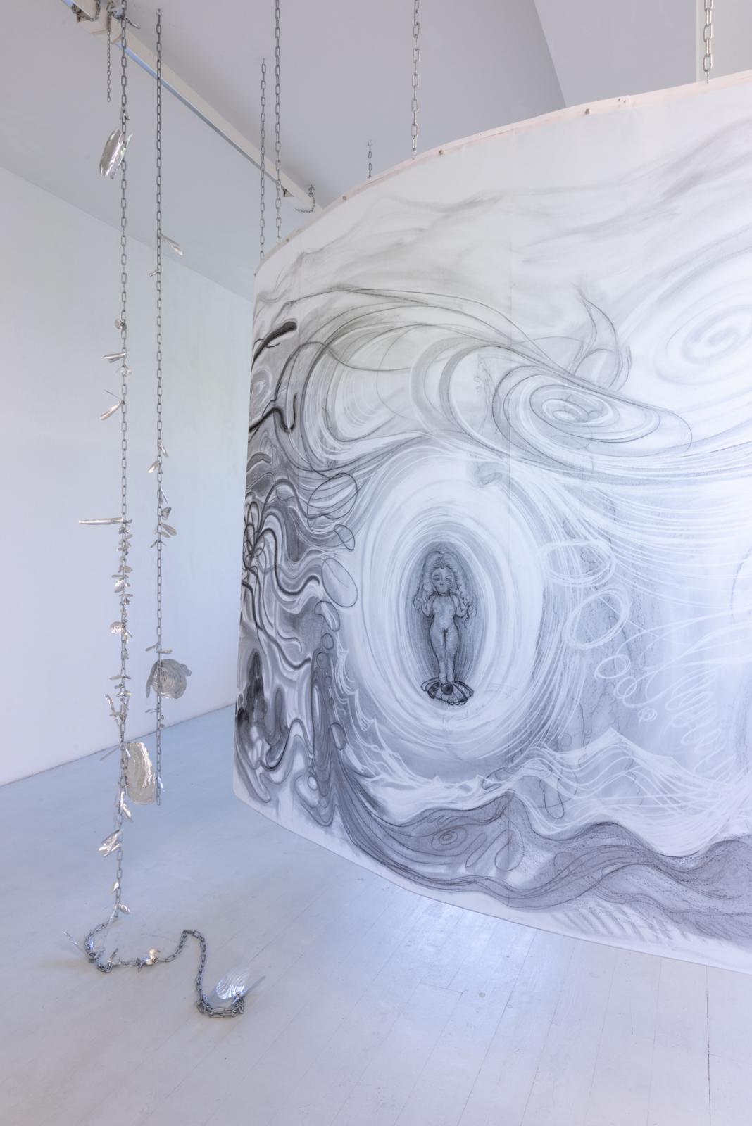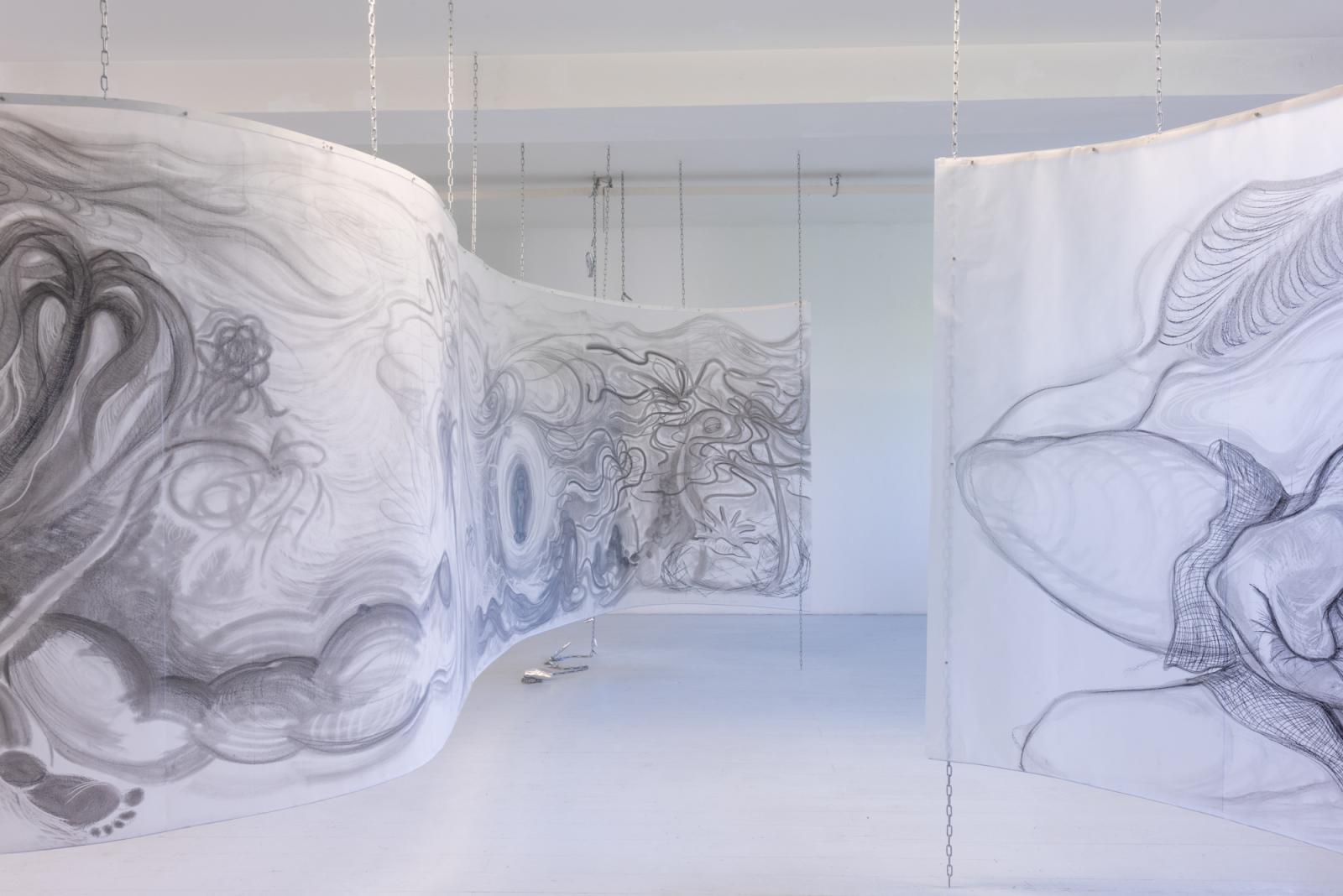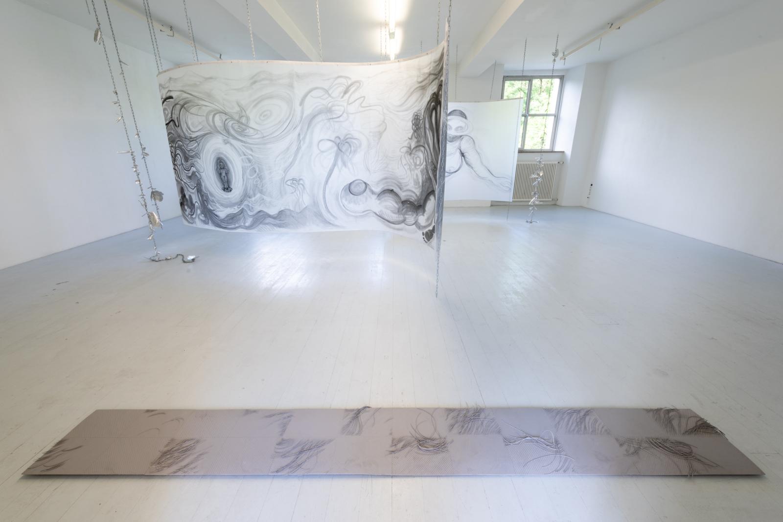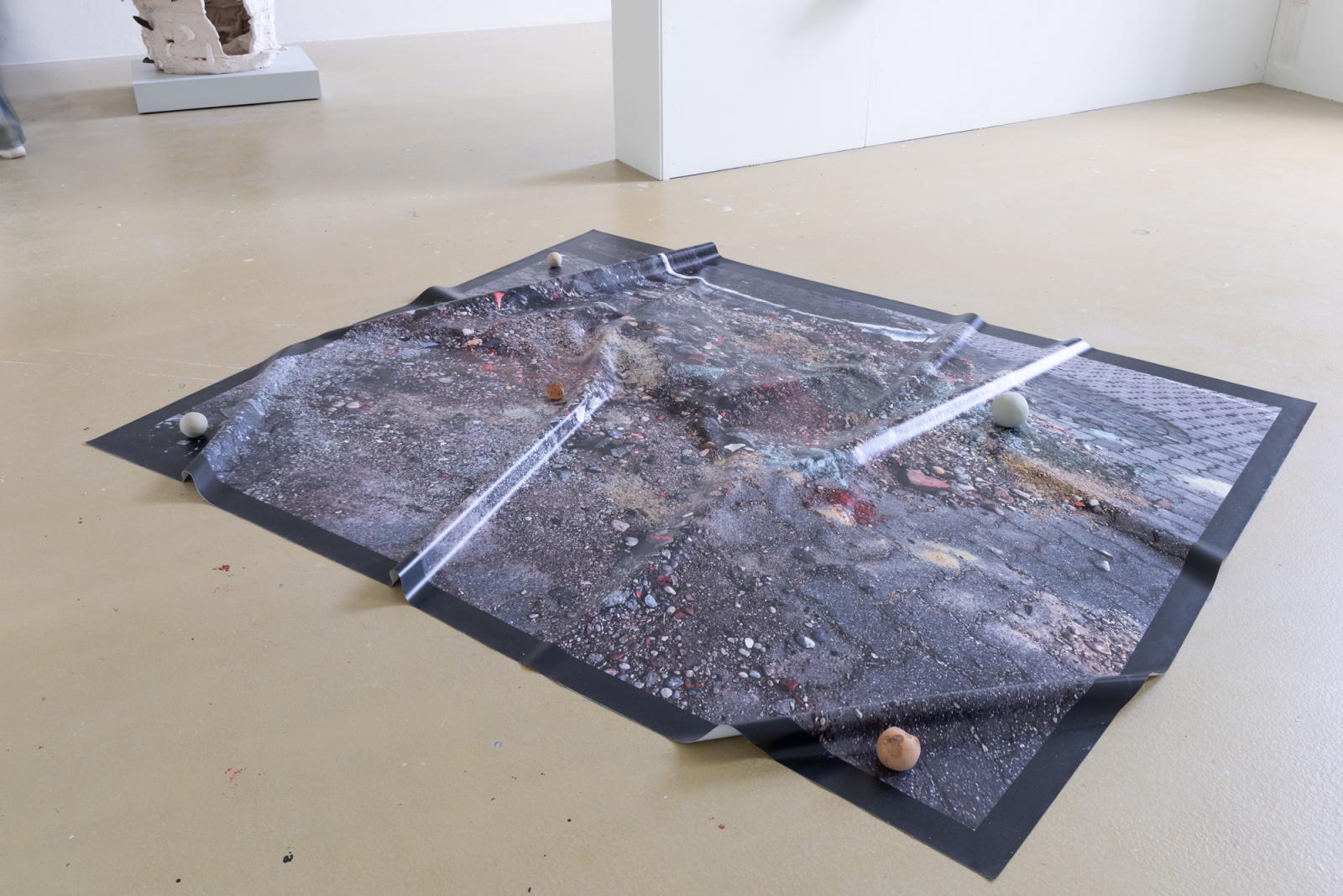 The works in the main class room feature localized alternative forms of labour and living. The activists protecting the Hambacher Forst from coal mining activities in Haha Wang’s video WOULD YOU WOULD YOU WOULD YOU...?, live in the tree tops, while the community of all-female free divers in Yuchu Gao‘s installation of drawings and sculptures gather their bounty at the bottom of the ocean. The geographical distance between the Haenyeo divers of South Korea and the activists in Germany, is mirrored by the spatial bracket in which their actvities take place. Between the dizzy heights and dark depths of their respective spheres lies the mundane urban pavement we walk on everyday, the elements of which Bokyoung Jeoung is reflecting in her floor piece which acts as a threshold to the exhibition space.