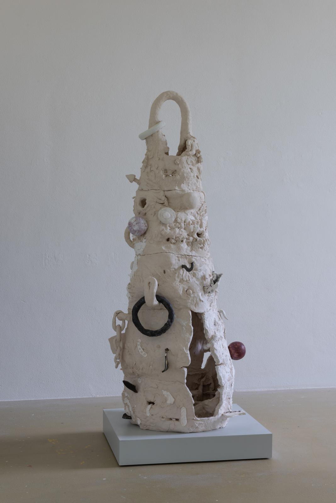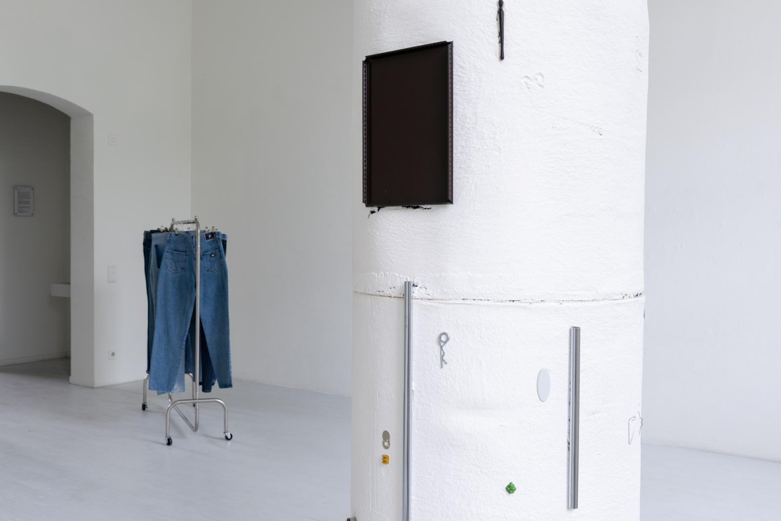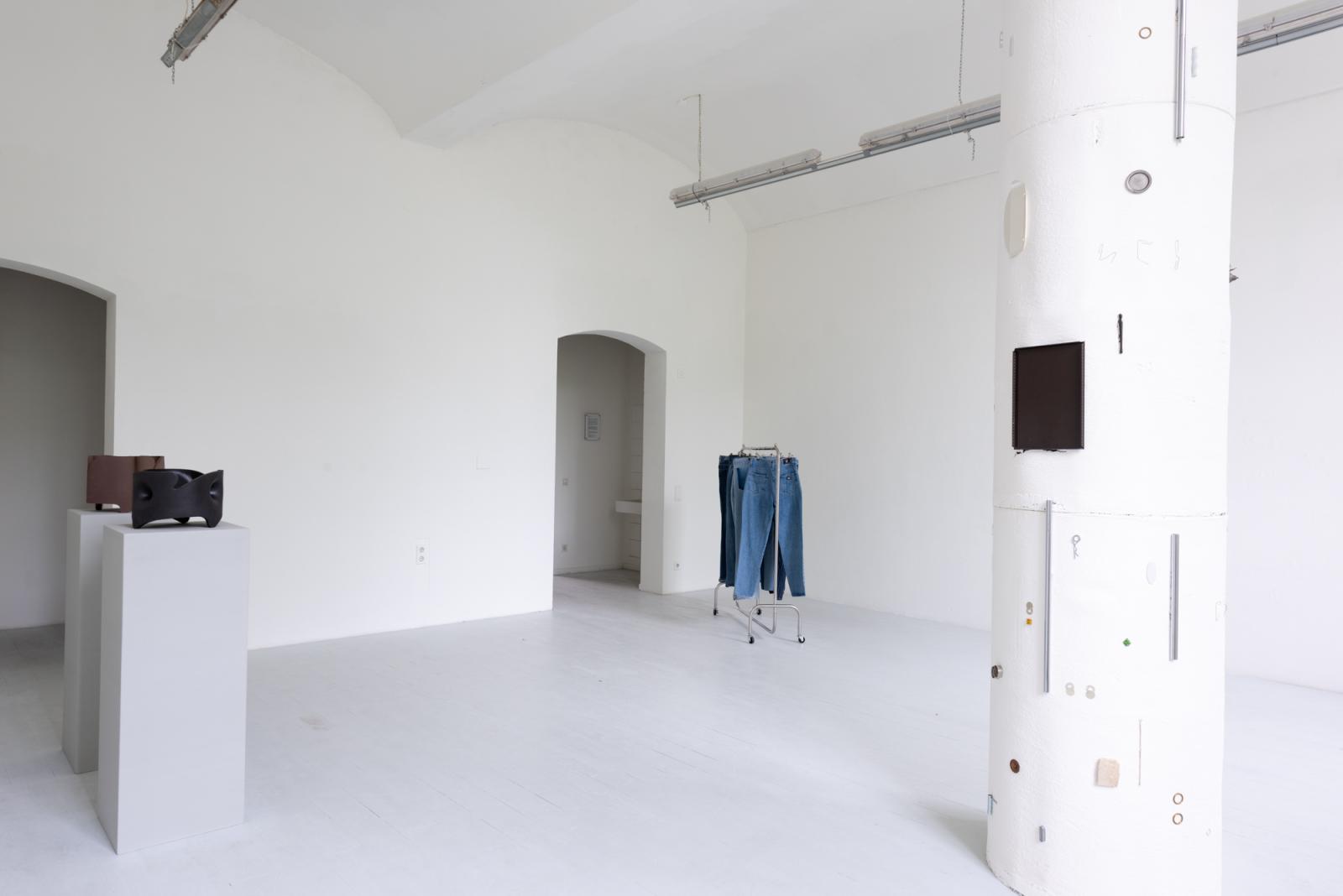 A couple of months ago Zhenyu Sun turned his tiny student flat into a second hand shop called Sun Set. Reacting to the economic pressures of the city of Munich, his new way of living in a shop display also inspired a new set of works. Sun deconstructs second-hand denim trousers, cheaply bought by the kilogram in China and reconstructs them into new trousers by mixing up the individual parts. He then sells them on to Second-Hand shops in Munich only to buy them back at a later point, thus illustrating the (international) cycles of garments and the changing values attributed to them. The thematic throughline of labour permeating private space is also present in Michael Mönnich's series of videographic vignettes. Encounters with animals caught up in their routine of mundane survival are used as opportunities for his own exercises in camera work. In following birds and insects that inhabit urban space, he is searching for modes of image production shaped by the everpresent pressures of everyday life. Laura Klodt-Bußmann‘s towering column, made from paper pulp is barely able to support itself, let alone the ceiling of the exhibition space. It is covered with fixings and fragments of structures used to create order in everyday life, which she pressed into the wet pulp. Not completely abstract but having lost all use value they hover between decoration and attempts at some sort of language. Nils Peisker’s abstract ceramics display intricate relationships of positive and negative space, inside and outside. They follow principles of rotation symmetry, the order of which is difficult to grasp from just one viewpoint. Without a bottom they are useless for storing or holding anything, yet still stem from his research into the history of ceramic vessels closely linked to that of reproductive labour as well as into architectures of power.