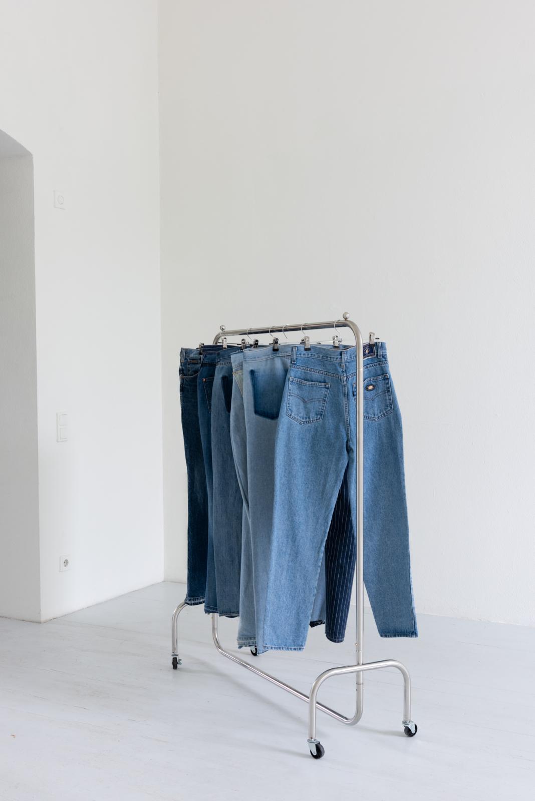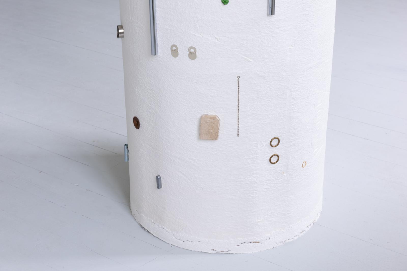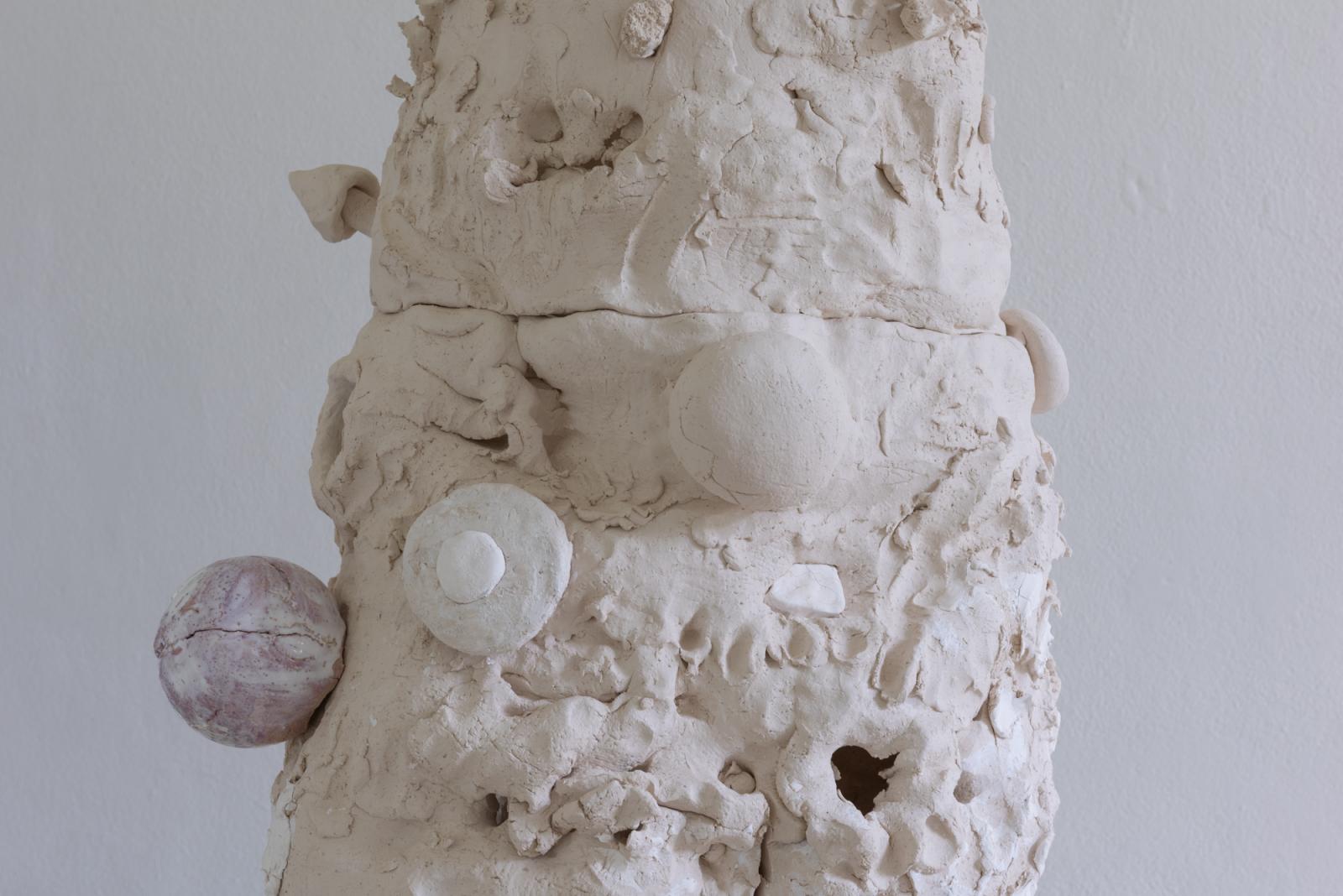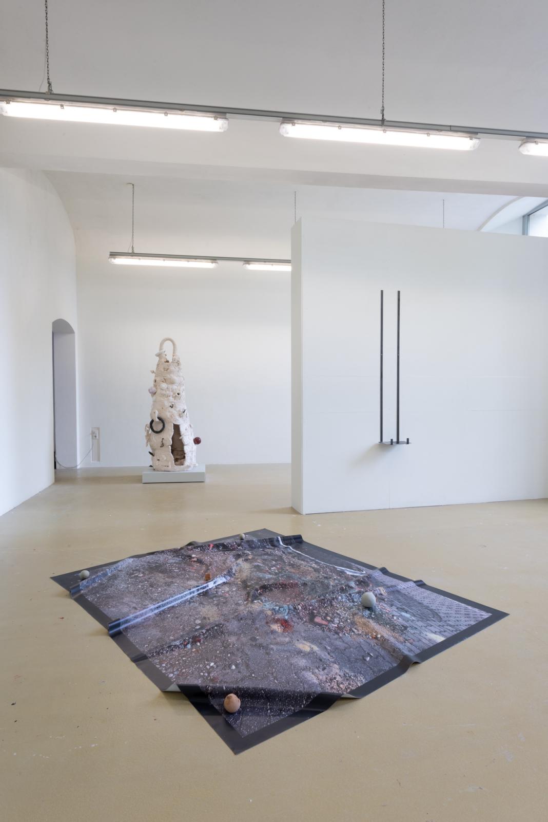 A couple of months ago Zhenyu Sun turned his tiny student flat into a second hand shop called Sun Set. Reacting to the economic pressures of the city of Munich, his new way of living in a shop display also inspired a new set of works. Sun deconstructs second-hand denim trousers, cheaply bought by the kilogram in China and reconstructs them into new trousers by mixing up the individual parts. He then sells them on to Second-Hand shops in Munich only to buy them back at a later point, thus illustrating the (international) cycles of garments and the changing values attributed to them. The thematic throughline of labour permeating private space is also present in Michael Mönnich's series of videographic vignettes. Encounters with animals caught up in their routine of mundane survival are used as opportunities for his own exercises in camera work. In following birds and insects that inhabit urban space, he is searching for modes of image production shaped by the everpresent pressures of everyday life. Laura Klodt-Bußmann‘s towering column, made from paper pulp is barely able to support itself, let alone the ceiling of the exhibition space. It is covered with fixings and fragments of structures used to create order in everyday life, which she pressed into the wet pulp. Not completely abstract but having lost all use value they hover between decoration and attempts at some sort of language. Nils Peisker’s abstract ceramics display intricate relationships of positive and negative space, inside and outside. They follow principles of rotation symmetry, the order of which is difficult to grasp from just one viewpoint. Without a bottom they are useless for storing or holding anything, yet still stem from his research into the history of ceramic vessels closely linked to that of reproductive labour as well as into architectures of power.