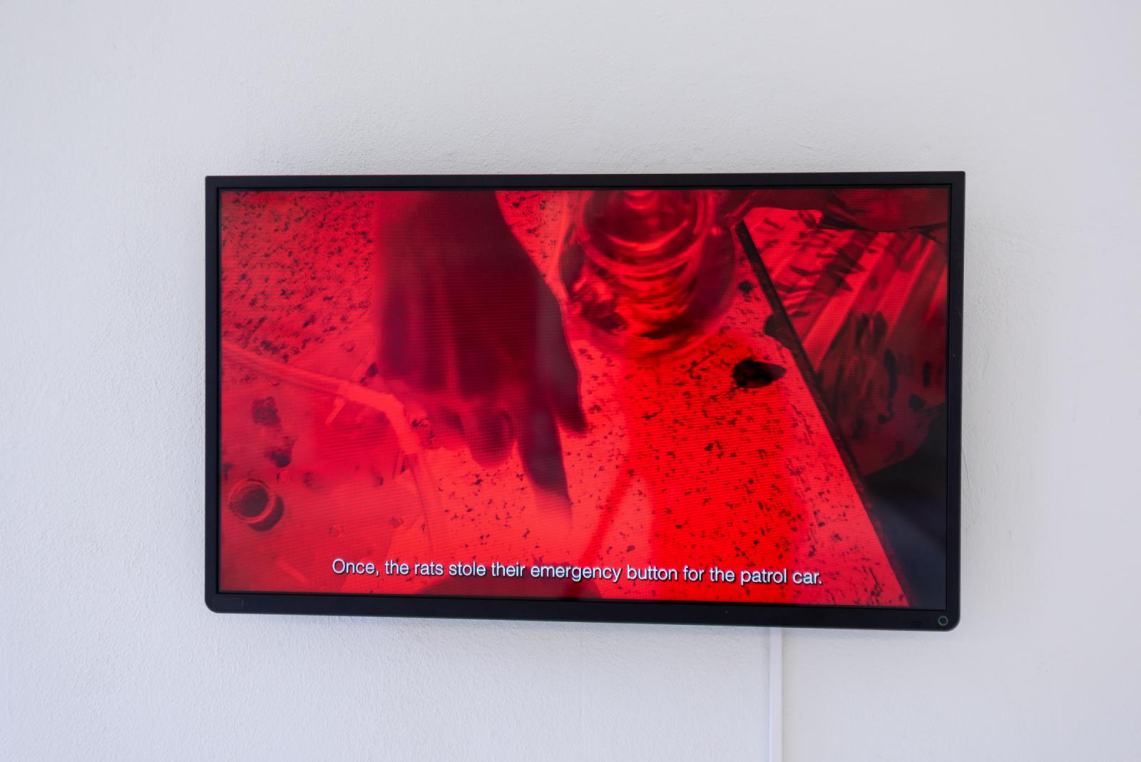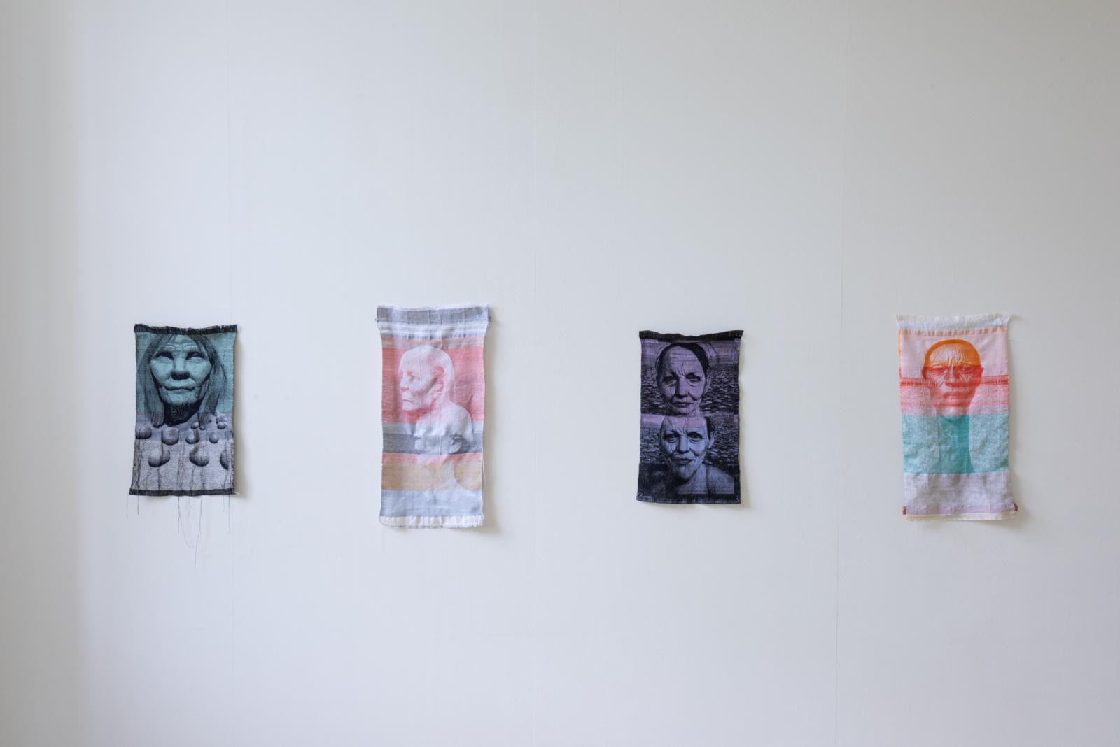 The works in this room explore various implications of technological progress as well as economic optimization and functionalization. A deep drilling on the premises of a vacant gas station serves as the starting point for Elisabeth Hofstetter's installation. The unstable and non-cooperative ground there had been declared as not sufficiently load-bearing for a more lucrative usage such as a multistory building. Adjacent to this work is Dixi by Janis Strobl, the full-scale textile replica of a portable toilet. For the duration of the exhibition the ready-made original is placed in an undisclosed location in the urban realm of Munich where it acts as a camouflaged storage facility for some of her belongings. Hannes Borgmeier’s large-scale ceramic sculpture incorporates a multitude of handles, hangers and connectors. Even though they invoke a vague functionality they are only able to support the fragile structure they themselves are a part of. A series of portraits by Gloria Sogl depict fictionalized versions of her grandmother who maintained a writing practice throughout her life while working as a weaver. On the basis of her writings they were produced with the help of an AI-based text-to-image-generator and woven on a programmable Jacquard loom, an early ancestor of contemporary computers. The relations between textile and text, weaving and programming which become apparent in these works are all tied together by a history of gendered, predominantly female labour. Finally, Rebecca Ruchti’s video piece is a poetic reflection on the disconnected presence of watchdogs she came across in Marseille. During the heat of the day the dogs lie silently in front of the supermarkets they are ordered to protect. But at night their disembodied voices, at least temporarily freed from their muzzles, roam the dormant neighbourhood.